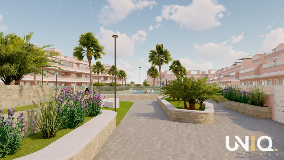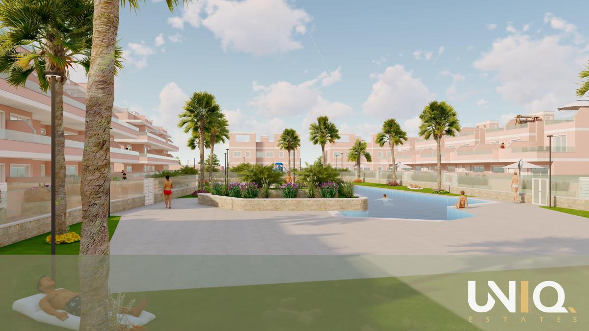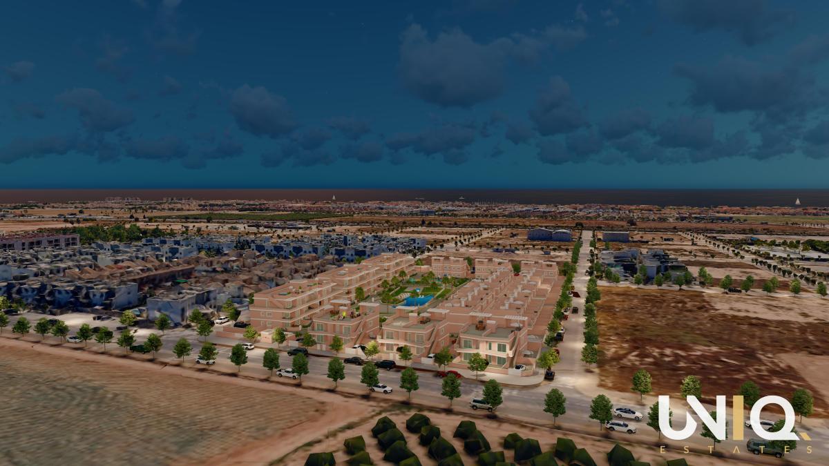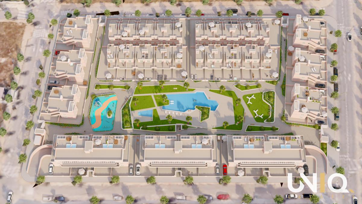 In een rustige, groene wijk net buiten het centrum van Pilar de la Horadada, vind je een ideaal woonconcept dat luxe en gemeenschapsgevoel harmonieus samenbrengt. Hier heb je de vrijheid om te kiezen uit een reeks stijlvolle nieuwbouwopties met telkens 3 slaapkamers en 2 badkamers – elk met hun eigen charme, uitzicht en buitenruimte. Je hebt keuze uit vier woontypes, afgestemd op uiteenlopende levensstijlen: de gelijkvloerse appartementen beschikken over een zonnige privétuin, ideaal voor wie graag buiten leeft. De tussenappartementen combineren comfort met overzichtelijke indelingen. Voor wie hoger wil wonen, bieden de penthouses een spectaculair privé-solarium, compleet met buitenkeuken, jacuzzi en douche – perfect voor lange avonden onder de sterren. En dan zijn er nog de townhouses: gesloten bebouwingen met meerdere niveaus en royale terrassen, geschikt voor gezinnen of wie graag ruim woont. Wat deze enclave zo bijzonder maakt, is de centrale gemeenschappelijke zone: een sfeervolle oase met aangelegde tuinen, een zwembad en een aparte speelzone voor kinderen. Alles is ontworpen om verbondenheid te stimuleren en tegelijk volop privacy te garanderen. Binnen overtuigen de woningen met doordachte details. Grote ramen met dubbel glas zorgen voor natuurlijk licht en thermisch comfort. De keukens zijn strak vormgegeven met boven- en onderkasten in wit of eiken, kwarts werkblad en hoogwaardige apparatuur zoals een oven, vaatwasser en wasmachine – allemaal inbegrepen. In de badkamers vind je zwarte kranen, glasdouches en stijlvolle meubels. De afwerking is warm en hedendaags, met keuze in vloeren en wandbekleding die je kunt personaliseren. Parkeerplaatsen zijn inbegrepen. Geef ons een seintje als je meer info wenst!
