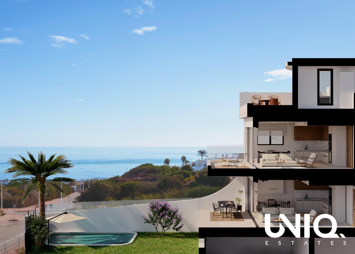 In La Mata woon je hier op een plek waar je de zee niet alleen ziet, maar ook voelt. Op amper 250 m van blauwvlagstranden, met restaurants en services vlakbij, en vlot richting Torrevieja (10’), natuurparken (10’) en de luchthaven van Alicante (35’) zit je precies goed voor zowel vakantie als verhuurpotentieel. Wat dit project zo sterk maakt, is hoe het terrein en de zeebries het ontwerp hebben gestuurd. De volumes volgen een langgerekt, hellend perceel en draaien subtiel mee om oriëntatie, licht en vooral dat vrije zeezicht maximaal te benutten. De zachte, witte lijnen en elegante curvatures creëren beschutte terrassen én een opvallend rustige uitstraling: modern, maar warm mediterraan. En dan is er die zeldzame combinatie: een gelijkvloers mét zeezicht. Dat komt aan de kust veel minder vaak voor dan je denkt, zeker wanneer je tegelijk een eigen tuin én privézwembad hebt om in alle privacy te ontspannen. Liever hoger? Kies dan voor een penthouse waar het dakterras het decor wordt voor lange avonden met panorama’s richting horizon. Daarnaast is er ook een gemeenschappelijk zwembad langs de zijkant van het complex, ideaal voor een frisse duik zonder onderhoud. Binnen draait alles om comfort met een slimme, energiezuinige aanpak: kruisventilatie, doordachte zonwering, sterke isolatie en hoogwaardige ramen helpen de temperatuur stabiel te houden. Verwarming, koeling en warm water worden ondersteund door een aerothermisch systeem; airconditioning is voorzien met een A+-rating en aandacht voor akoestisch comfort. Welke unit je ook kiest: overal geniet je van een praktische, waardevaste indeling met 2 slaapkamers en 2 badkamers. Perfect voor eigen gebruik, gasten én aantrekkelijke verhuur.