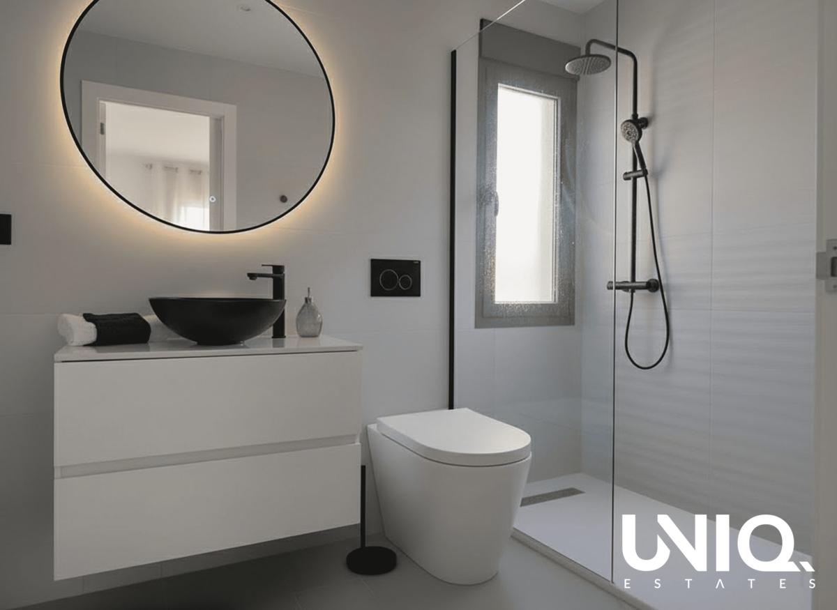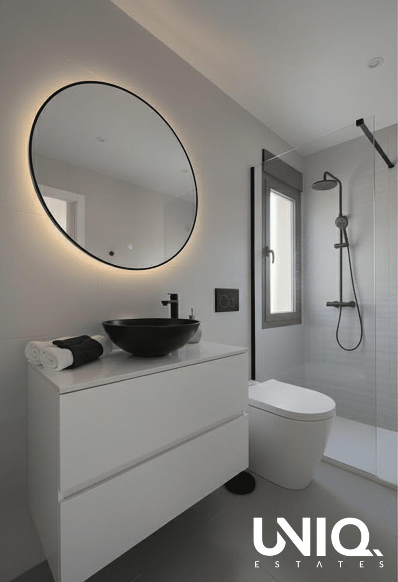 Ook praktisch is alles netjes geregeld: een veiligheidsdeur, ingebouwde kasten met ladeblokken, videofoon, LED-verlichting en aerothermie voor warm water, ... Buiten wachten 2 verlichte zwembaden, palmen, wandelpaden—en je eigen parkeerplaats met berging.