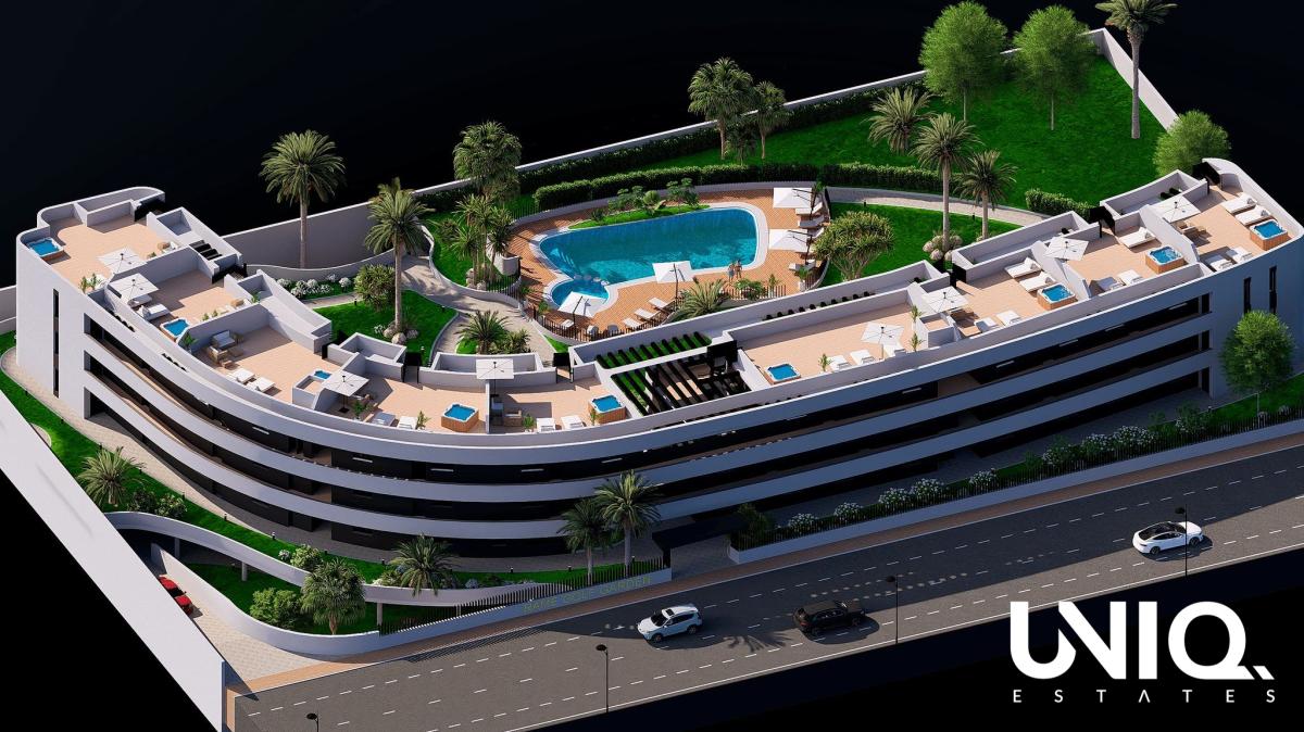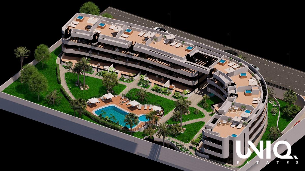 Stel je een gebouw voor dat niet “rechttoe rechtaan” is, maar meebuigt met het licht. Een elegante, moderne residentie met zachte lijnen, brede terrassen en een rustige, groene binnentuin als hart. Hier woon je aan La Serena Golf, in Los Alcázares (Murcia), met de kust en het open landschap als trouwe levensgezellen. Binnen draait alles om de relaxte sfeer dat je elke dag opsnuift. Grote schuifpartijen halen de buitenlucht naar binnen, terwijl de afwerking bewust tijdloos blijft: porseleinen vloeren in formaat 60x60, strakke interieurlijnen en badkamers in helder porselein met een warme houtlook-accentwand. De keuken is ontworpen als leefruimte—met de toestellen al voorzien—zodat je je als hobbykok volledig kan uitleven. De appartementen zijn er met 2 of 3 slaapkamers en 2 badkamers. Buitenruimte is een echte troef: terrassen lopen grofweg van ca. 16–49 m², en bij penthouses komt daar een privésolarium van ca. 63–78 m² bovenop. Op die bovenste niveaus hoort een buitenkeuken (met granieten werkblad en spoelbak) bij het concept. Helemaal gebruiksklaar voor onvergetelijke momenten. Ook praktisch is alles netjes geregeld: een veiligheidsdeur, ingebouwde kasten met ladeblokken, videofoon, LED-verlichting en aerothermie voor warm water, ... Buiten wachten 2 verlichte zwembaden, palmen, wandelpaden—en je eigen parkeerplaats met berging. Wil jij investeren aan La Serena Golf, dat een gouden toekomst tegemoet gaat?