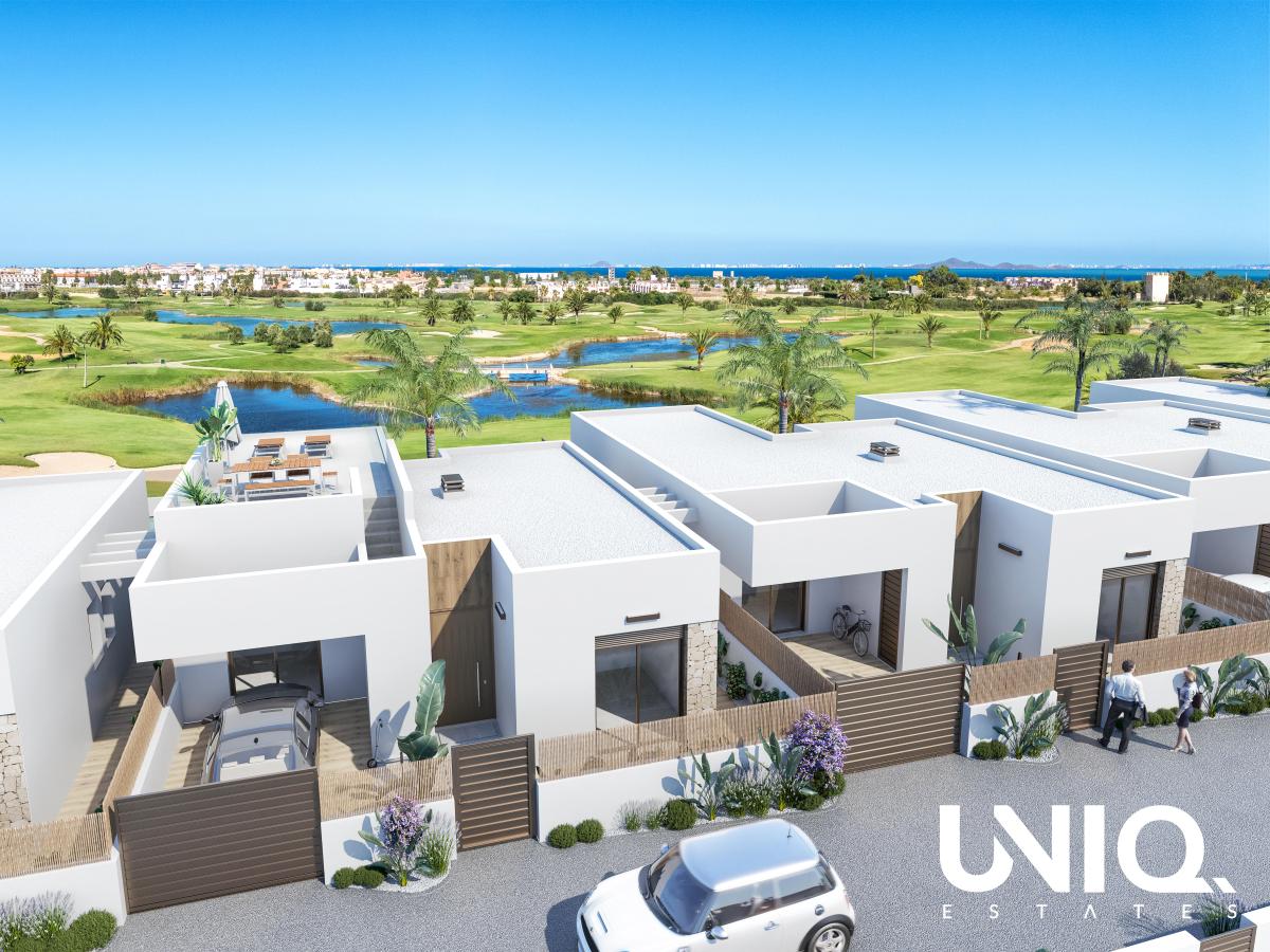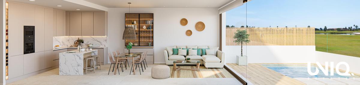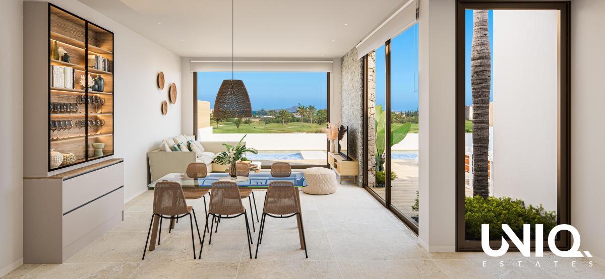 Je merkt het al vóór je binnenstapt: hier draait alles om rust, ruimte en dat onverstoord uitzicht op La Serena Golf. Geen vluchtige “golf view”, maar écht frontline – met waterpartijen en groen dat zich als een zorgvuldig onderhouden tapijt door het landschap vlecht. La Serena staat bekend om zijn meren en vegetatie, met water in 16 van de 18 holes, én het fijne detail dat je gewoon te voet richting het centrum van Los Alcázares wandelt. Zo voelt het sereen, maar nooit afgelegen.