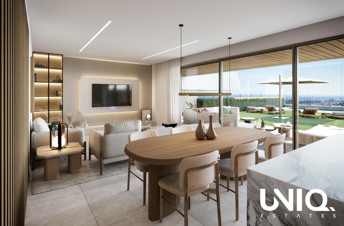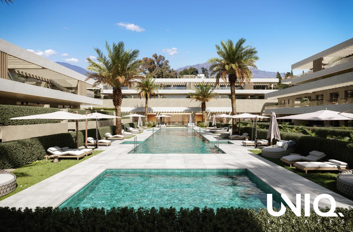 In een gevestigde woonomgeving tussen Marbella en Estepona ligt een afgesloten residentie waar laagbouw, groen en licht het eindwoord hebben. De architectuur is strak en mediterraan tegelijk: zachte aardetinten, pergola-achtige lijnen en terrassen die als extra leefruimte aanvoelen.