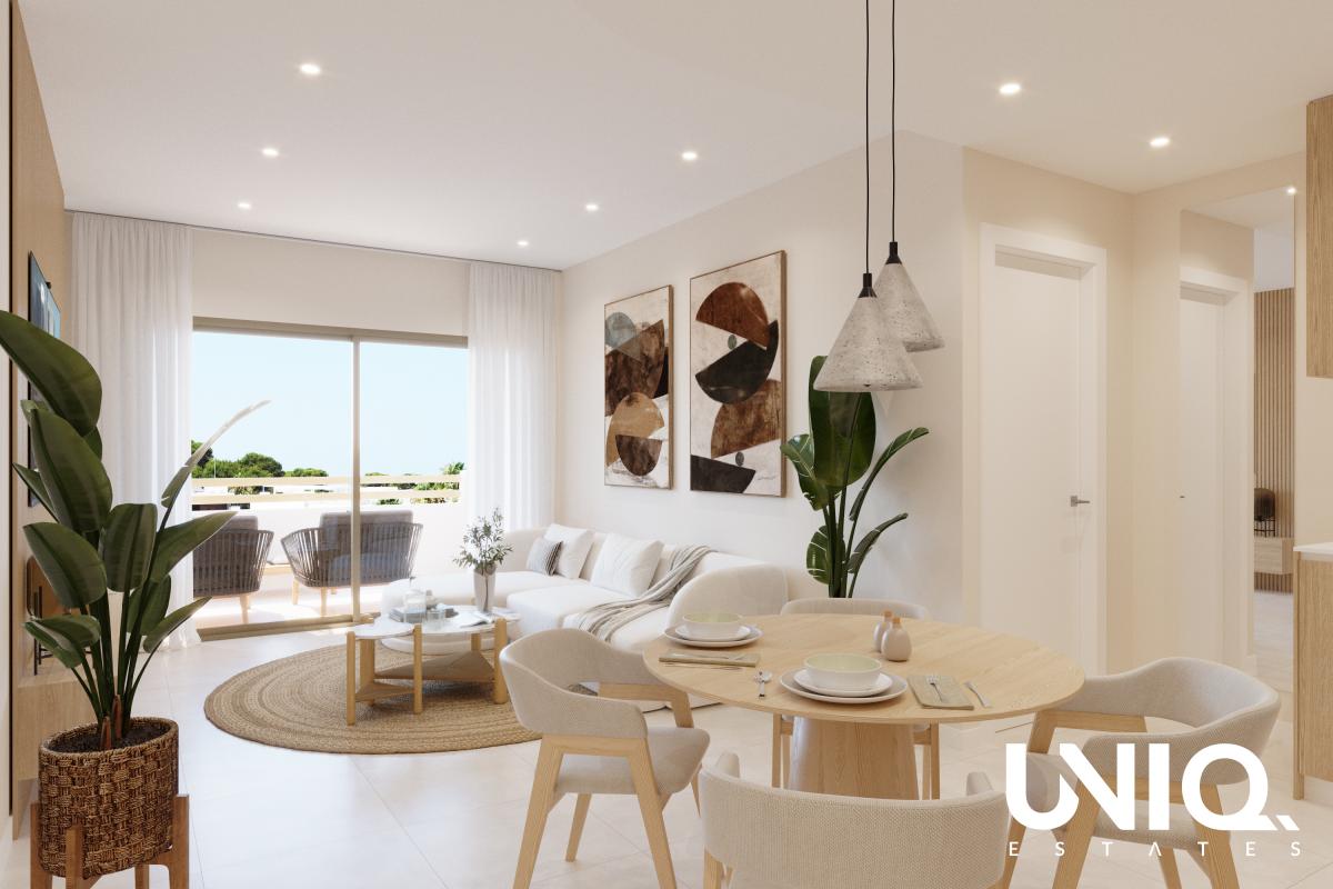 In a quiet corner of San Pedro del Pinatar (Murcia) lies a small-scale new-build concept with just eight residential units, designed for those who love light, privacy, and effortless outdoor living. Here, you make a conscious choice: either ground floor living with a small garden and extra patio, or higher up with a penthouse and a spacious solarium where the day seems to last longer. Inside, everything feels modern and soft at the same time: an open living space with large sliding windows, LED lighting, and a kitchen in a stylish mix of wood and matte white. The finish is sleek and maintenance-friendly, with a fresh, contemporary look that is suitable for a second home or for rental. Each apartment has 2 bedrooms and 2 bathrooms, with living areas of approximately 68–86 m². On the ground floor, you can enjoy extra outdoor space (front terrace up to 64 m² and a rear patio of 25 m²) — ideal for a lounge area, a dining table in the shade, and still surrounded by greenery. If you opt for a penthouse, in addition to your terrace, you will also have a solarium of approx. 90 m²: pure freedom for sunbathing, dining, or a quiet place to work in the open air. As a resident, you share a large communal swimming pool with a leisure area, and you are close to the beach: exactly the combination that makes this type of home so desirable.