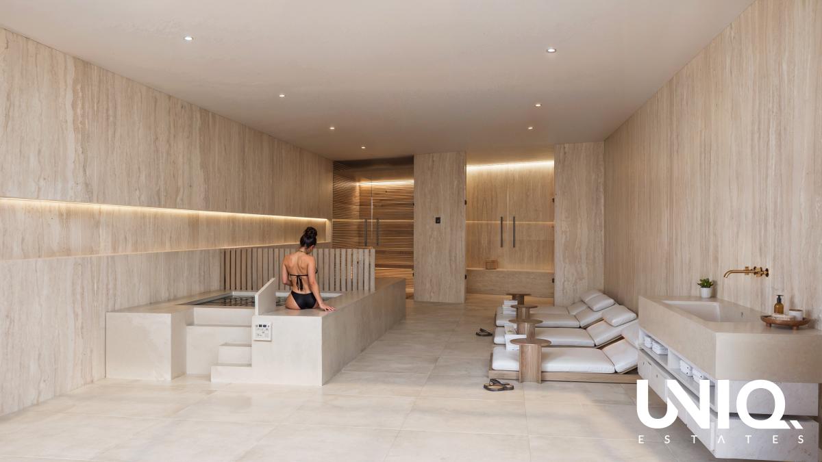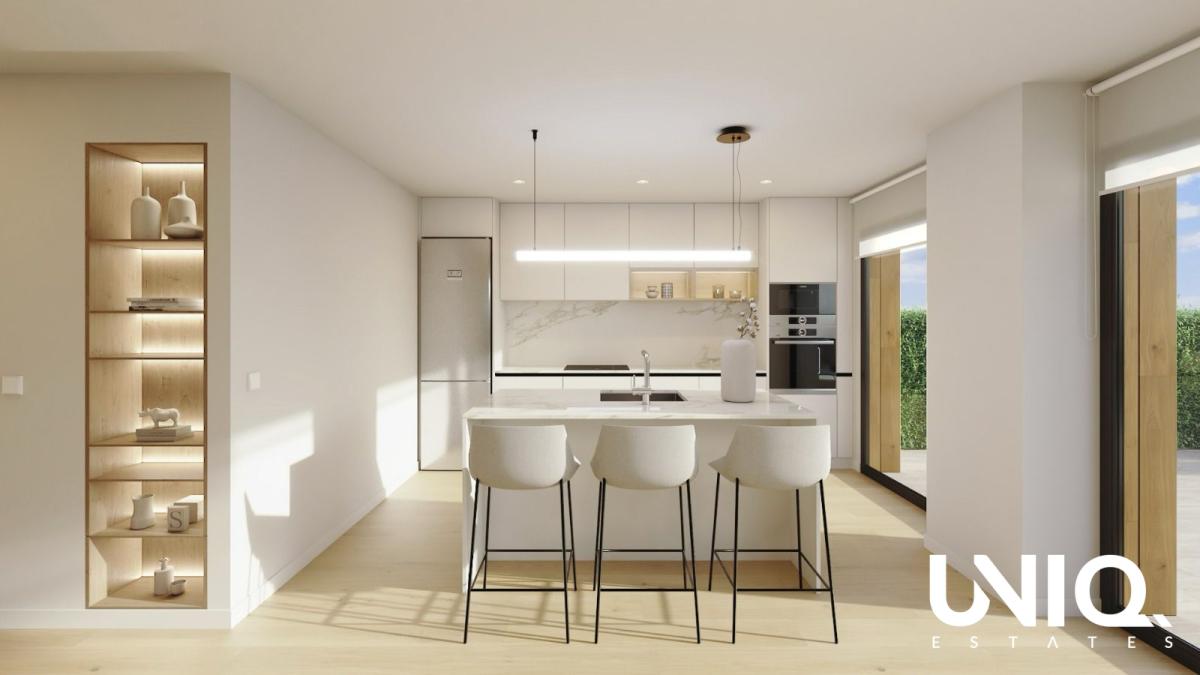 The kitchen is fully fitted with appliances (Bosch or equivalent) and a Silestone-style worktop. Bathrooms are fully equipped with vanity units, mirrors, shower screens and rain showers. Climate control is provided all year round thanks to aerothermal heating and cooling via ducts.