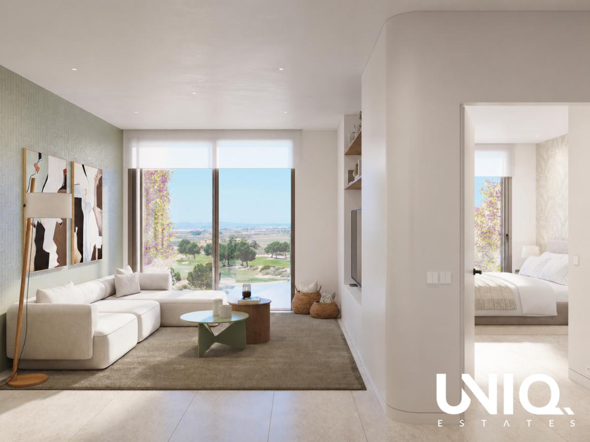 Le matin, vous ouvrez les grandes baies vitrées et contemplez le vert vallonné du terrain de golf. Une sensation à laquelle vous ne vous lasserez jamais, même au quotidien. Ce projet offre tout ce qui caractérise un cadre de vie luxueux. Vous choisissez ici l'appartement qui correspond à votre style de vie : 2 ou 3 chambres, au rez-de-chaussée avec un espace extérieur généreux, au 1er ou au 2e étage pour une vue panoramique supplémentaire, ou un penthouse avec terrasse sur le toit où les soirées peuvent se prolonger. À l'intérieur, la cuisine, la salle à manger et le salon se fondent les uns dans les autres, dans un espace lumineux et aéré, conçu avec des matériaux haut de gamme et des finitions épurées et contemporaines. Pensez aux carreaux de sol en porcelaine, aux spots LED encastrés et aux menuiseries en aluminium avec rupture thermique et double vitrage à contrôle solaire. La cuisine ouverte est entièrement équipée d'un îlot et d'un plan de travail de qualité, et les appareils électroménagers sont également fournis : four, micro-ondes, réfrigérateur, lave-vaisselle, plaque à induction avec hotte intégrée et lave-linge/sèche-linge. La climatisation est incluse et l'eau chaude est fournie par une technologie aérothermique. L'ambiance de station balnéaire ne se limite pas à la vue. Vous vivez dans un complexe de golf doté d'équipements qui facilitent un peu plus votre quotidien : des jardins communs aménagés, une piscine commune, un espace fitness et les installations d'El Valle Golf Resort à portée de main. De plus, vous êtes bien desservi : le centre de Murcie se trouve à environ 15 minutes et les plages de la Mar Menor à moins de 25 minutes. Vous pouvez garer votre voiture et ranger vos affaires dans votre parking privé et votre débarras. Vous souhaitez réserver votre billet pour une tranquillité absolue ? Faites-le-nous savoir !