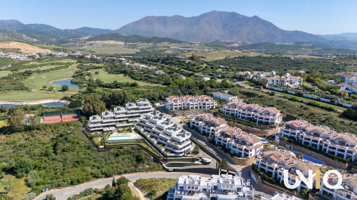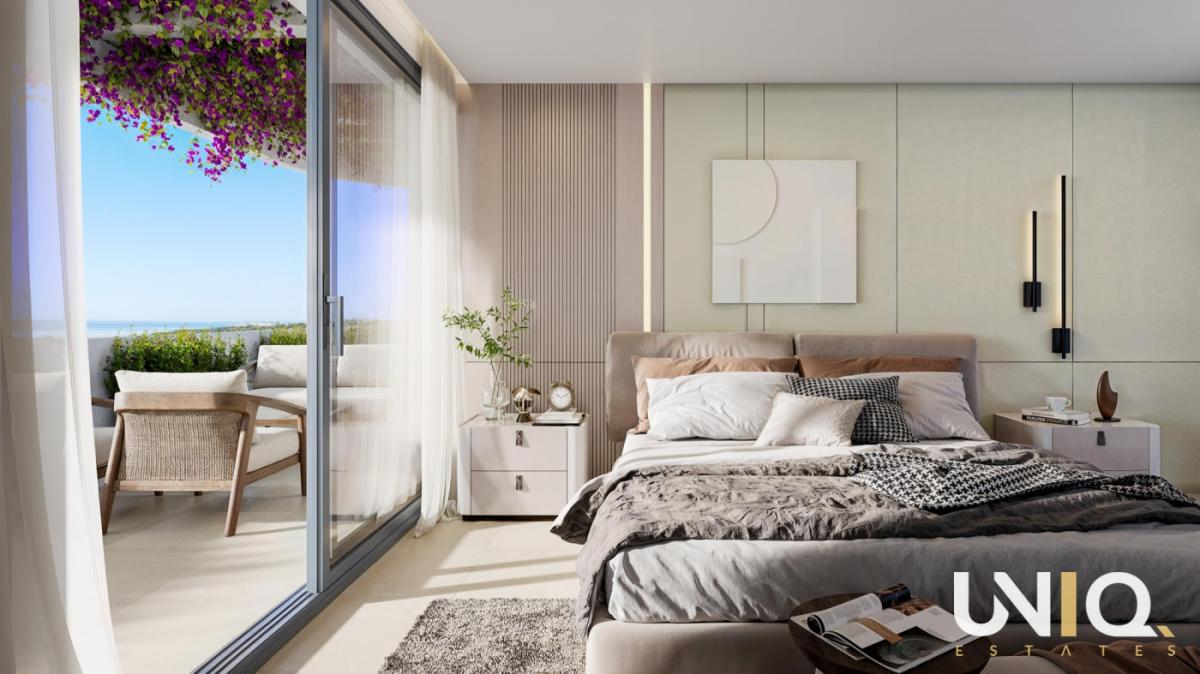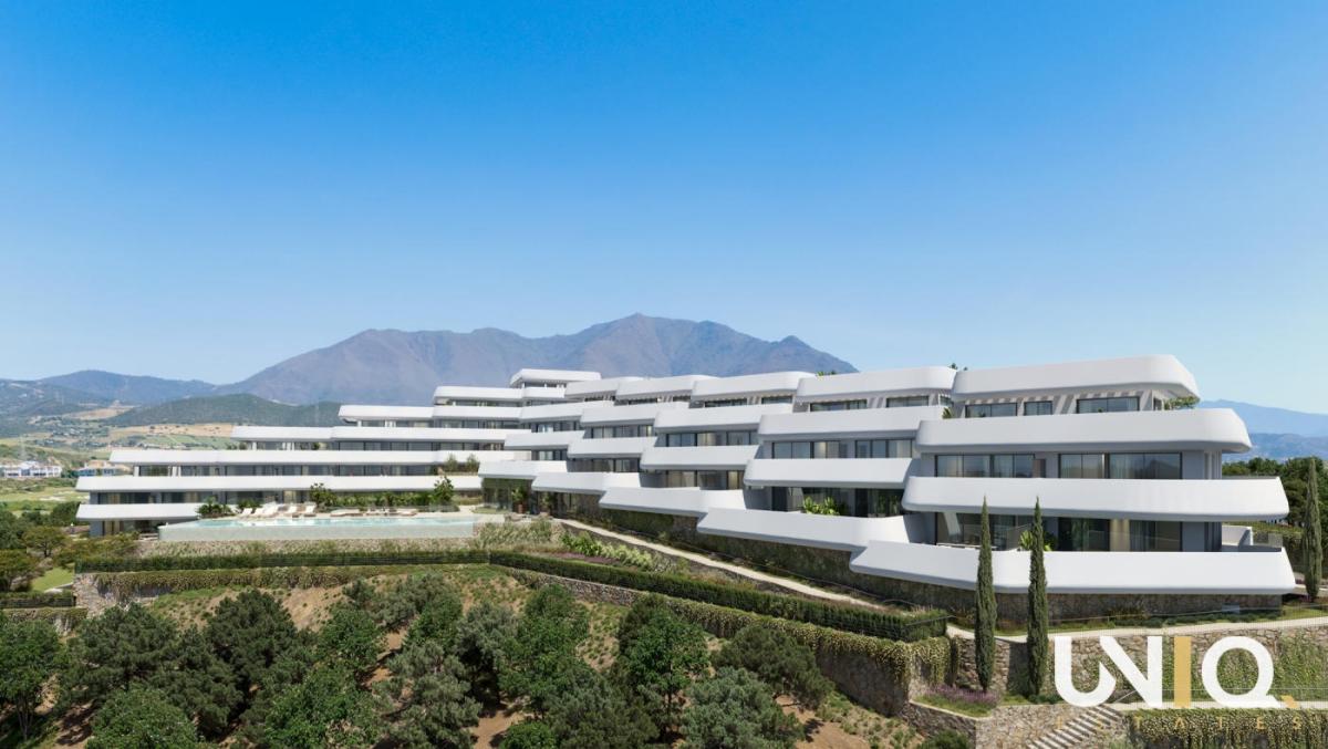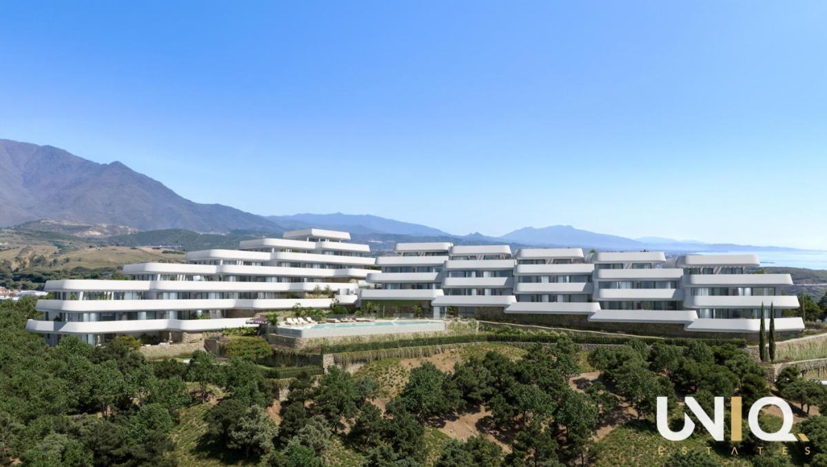 In one of the most exclusive locations in Casares, a residence unfolds where architecture and nature complement each other effortlessly. The ten buildings are built in tiers against the hillside, allowing the apartments to enjoy open views of the Mediterranean Sea and the rolling greenery of the highly sought-after Finca Cortesin golf course. There is a wide range of options: spacious ground floor apartments with private gardens, bright middle floors with generous terraces and sun exposure, or exclusive penthouses with corner terraces that frame the horizon. All types are designed around light, space, and tranquility, with 3 bedrooms, 2 bathrooms, and a guest toilet. The interiors exude sophistication with their natural tones, rounded shapes, and large windows that blur the boundary between indoors and outdoors. The communal areas take everyday life to a higher level. An infinity pool with a saltwater system reflects the sky and visually flows into the sea. Surrounding it is a sun-drenched solarium, a chill-out lounge, and Mediterranean gardens. For active moments, there is a fully equipped gym and an inspiring coworking lounge overlooking the pool areas. Located close to Estepona and Sotogrande, this project is a home base that combines luxury, tranquility, and accessibility. Here, every day begins with the golden light of the Mediterranean Sea and ends with sunsets that leave a lasting impression. Ready for the exclusive Costa del Sol lifestyle?