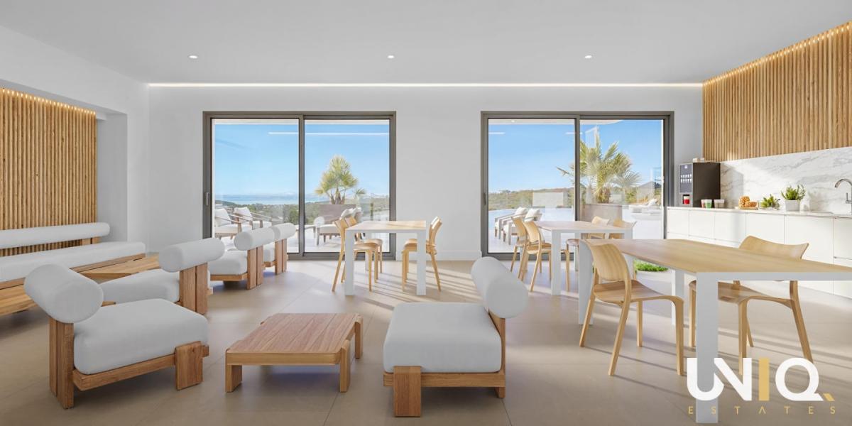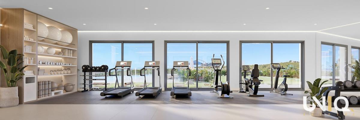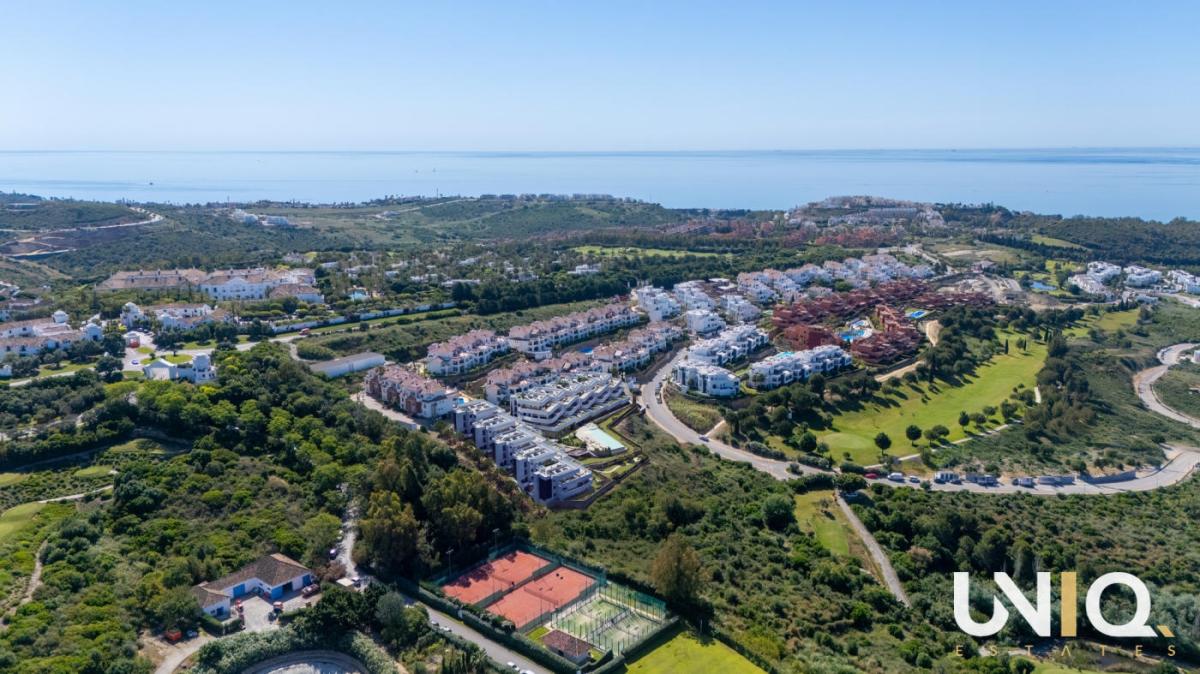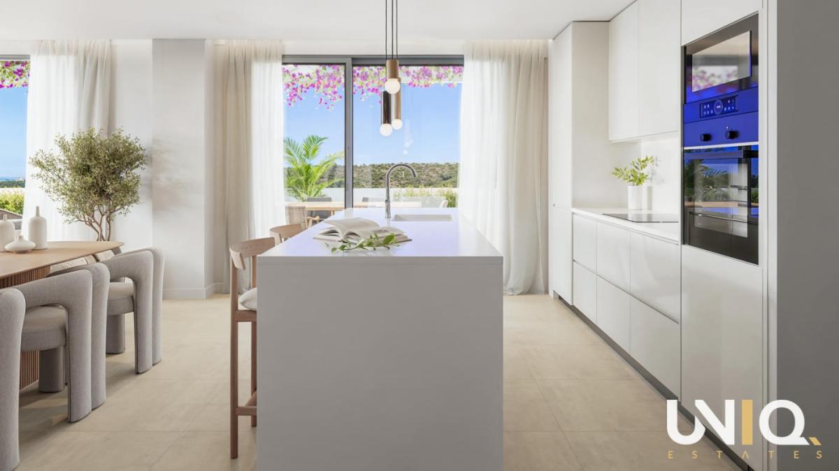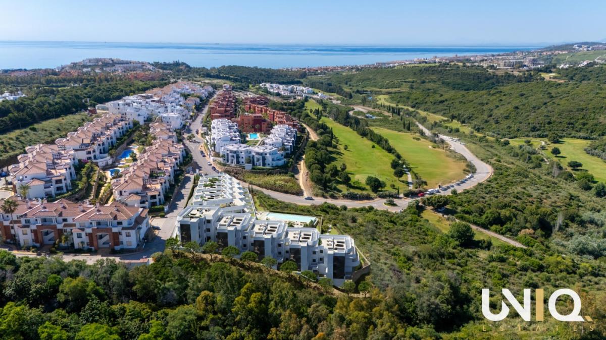 In one of the most exclusive locations in Casares, a residence unfolds where architecture and nature complement each other effortlessly. The ten buildings are built in tiers against the hillside, allowing the apartments to enjoy open views of the Mediterranean Sea and the rolling greenery of the highly sought-after Finca Cortesin golf course. There is a wide range of options: spacious ground floor apartments with private gardens, bright middle floors with generous terraces and sun exposure, or exclusive penthouses with corner terraces that frame the horizon. All types are designed around light, space, and tranquility, with 3 bedrooms, 2 bathrooms, and a guest toilet. The interiors exude sophistication with their natural tones, rounded shapes, and large windows that blur the boundary between indoors and outdoors. The communal areas take everyday life to a higher level. An infinity pool with a saltwater system reflects the sky and visually flows into the sea. Surrounding it is a sun-drenched solarium, a chill-out lounge, and Mediterranean gardens. For active moments, there is a fully equipped gym and an inspiring coworking lounge overlooking the pool areas. Located close to Estepona and Sotogrande, this project is a home base that combines luxury, tranquility, and accessibility. Here, every day begins with the golden light of the Mediterranean Sea and ends with sunsets that leave a lasting impression. Ready for the exclusive Costa del Sol lifestyle?